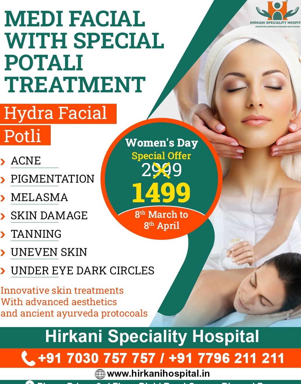 ✨ Medi Facial with Special Potali Treatment ✨ Experience the perfect blend of advanced aesthetics and ancient Ayurveda protocols for healthy, glowing skin. 🌿 Treatments Include: ✔ Hydra Facial ✔ Special Potli Treatment 💆♀️ Helps Treat: • Acne • Pigmentation • Melasma • Skin Damage • Tanning • Uneven Skin Tone • Under Eye Dark Circles 💐 Women’s Day Special Offer 💐 ₹1499 Only 📅 Offer Valid: 8th March to 8th April Rejuvenate your skin with innovative treatments at 📍 Hirkani Speciality Hospital #WomensDayOffer #MediFacial #HydraFacial #AyurvedaSkinCare #HealthySkin #HirkaniHospital #SkinCareTreatment #GlowSkin ✨🌿