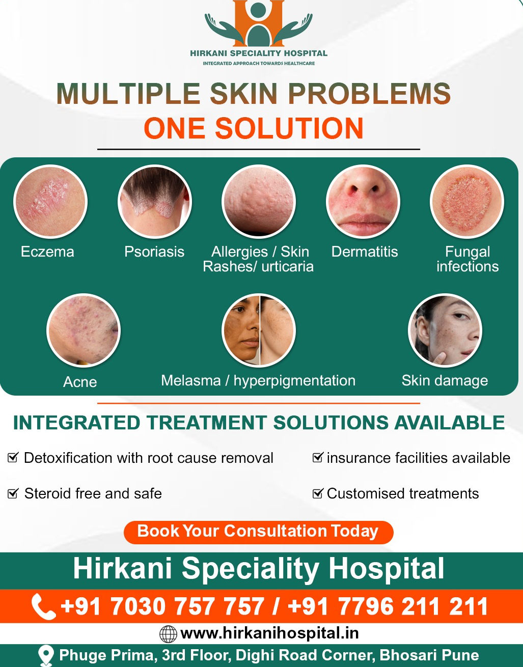 We offer INTEGRATED TREATMENT SOLUTIONS AVAILABLE With perfect blend of Ayurveda and Allopathy treatments At our Hirkani Speciality Hospital For multiple skin problems like Eczema Psoriasis Allergies Skin Rashes urticaria Dermatitis Fungal infections Melasma hyperpigmentation Skin damage Acne With Detoxification with root cause removal insurance facilities available Steroid free and safe Customised treatments We are the integrated multispeciality hospital in PCMC Pune providing quality medical care with all super specialities available in both Ayurveda and Allopathy Science under one roof . Here's what we offer AVAILABLE SPECIALITIES ◾ General Medicine ◾Pulmonology(chronic respiratory diseases) ◾ Cardiology ◾Diabetology ◾ General surgery ◾ Laproscopic surgery ◾Gynaecology and obstetrics care ◾ Urology & Nephrology ◾ Orthopaedics(joint and spine) & Advanced pain management ◾ Neurosurgery ◾Oncosurgery n medical oncology ◾ENT surgery ◾ Plastic surgery AVAILABLE SERVICES ◾ICU and trauma care ◾Day care facilities ◾24-7 pharmacy ◾ General wards ◾Delux AC room ◾ Semispecial AC room ◾ Pathology services ◾ Physiotherapy ◾ Insurance facility ◾24-7Ambulance services AYURVEDA AND WELLNESS SERVICES ◾ Ayurveda and panchakarma treatments ◾Hair skin and spa treatments and wellness packages ◾Garbhasanskar program for Antenatal and postnatal care ◼️Integrated protocols in cardiology Diabetology gynec orthopaedic neurology urology etc. CASHLESS INSURANCES AVAILABLE For compassionate care and expert medical attention, reach out us
