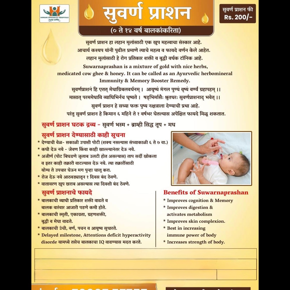 SUWARNAPRASHAN - AN AYURVEDIC IMMUNO BOOSTER Reminder For SUWARNAPRASHAN 8th December 2025 Swarnaprashan is an ancient Ayurvedic practice involving the oral administration of a mixture containing purified gold ash (swarna bhasma), honey, ghee (clarified butter), and various immunity-boosting herbs. It is primarily given to children from birth up to 16 years of age for overall We are providing best quality SUWARNAPRASHAN at our Hirkani Hospital which helps as immunity booster, cognitive development, physical strength n digestion and good skin quality n fairness. We are the integrated multispeciality hospital in PCMC Pune providing quality medical care with all super specialities available in both Ayurveda and Allopathy Science under one roof . Here's what we offer AVAILABLE SPECIALITIES ◾ General Medicine ◾Pulmonology(chronic respiratory diseases) ◾ Cardiology ◾Diabetology ◾ General surgery ◾ Laproscopic surgery ◾Gynaecology and obstetrics care ◾ Urology & Nephrology ◾ Orthopaedics(joint and spine) & Advanced pain management ◾ Neurosurgery ◾Oncosurgery n medical oncology ◾ENT surgery ◾ Plastic surgery AVAILABLE SERVICES ◾ICU and trauma care ◾Day care facilities ◾24-7 pharmacy ◾ General wards ◾Delux AC room ◾ Semispecial AC room ◾ Pathology services ◾ Physiotherapy ◾ Insurance facility ◾24-7Ambulance services AYURVEDA AND WELLNESS SERVICES ◾ Ayurveda and panchakarma treatments ◾Hair skin and spa treatments and wellness packages ◾Garbhasanskar program for Antenatal and postnatal care ◼️Integrated protocols in cardiology Diabetology gynec orthopaedic neurology urology etc. CASHLESS INSURANCES AVAILABLE For compassionate care and expert medical attention, reach out us